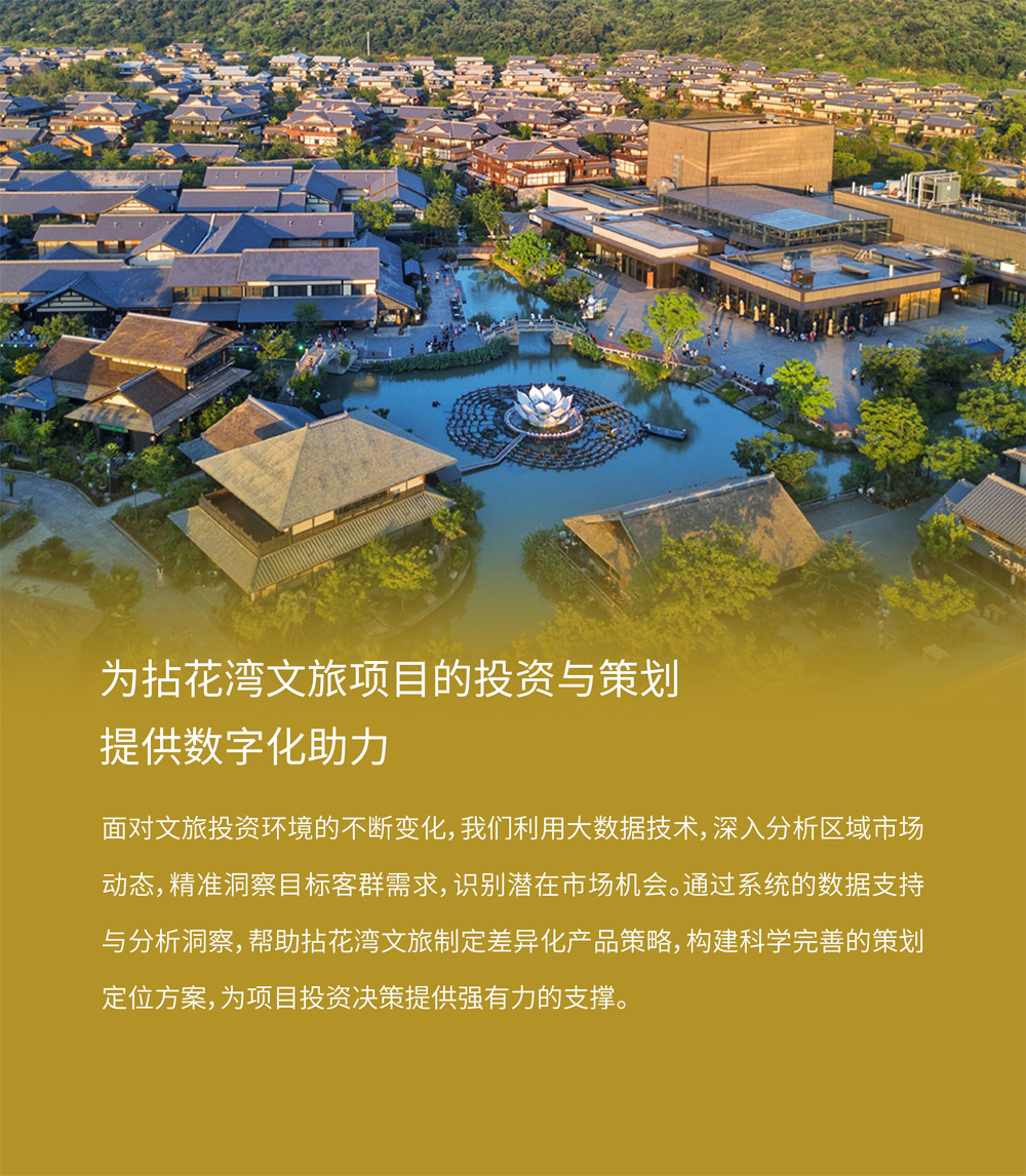 面对文旅投资环境的不断变化,我们利用大数据技术,深入分析区域市场动态,精准洞察目标客群需求,识别潜在市场机会。通过系统的数据支持与分析洞察,帮助拈花湾文旅制定差异化产品策略,构建科学完善的策划定位方案,为项目投资决策提供强有力的支撑。