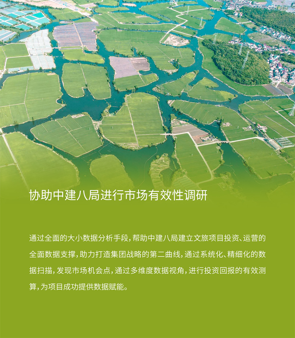 通过全面的大小数据分析手段,帮助中建八局建立文旅项目投资、运营的全面数据支撑,助力打造集团战略的第二曲线,通过系统化、精细化的数据扫描,发现市场机会点,通过多维度数据视角,进行投资回报的有效测算,为项目成功提供数据赋能。